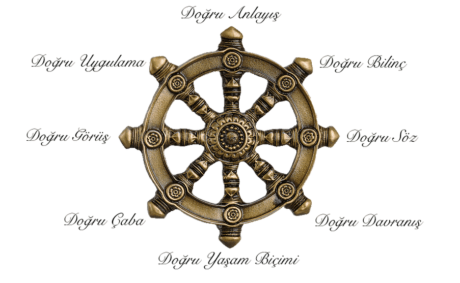 Dharma Wheel; ruhların hayat çarkının içinde doğup, aydınlanıncaya kadar tekrar doğacaklarının simgelenmiş halidir. Doğru görüş, doğru anlayış, doğru davranış, doğru çaba, doğru uygulama, doğru söz, doğru bilinç, doğru yaşam biçimi olarak “8 Asil Basamak” ile simgelenir. Diğer ismi ile “Doğa Kanunları ve Maddenin Çarkı” büyük zaman siklüslerinde dönmekte ve enkarne olan ruhlar çıkışı buluncaya kadar devri devam etmektedir.